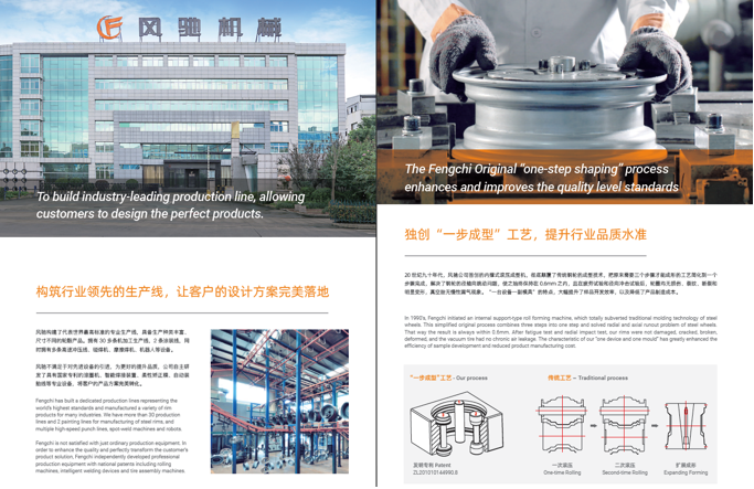 浙江風馳機械有限公司,成立于1994年,伴隨著時間的飛逝,一直以工匠精神專注生產(chǎn)非公路低速車輛輪轂,在董事長潘衛(wèi)民的英明帶領(lǐng)下,風馳以自信、沉穩(wěn)、堅實的腳步,企業(yè)逐步成為了世界500強合作伙伴、申請了企業(yè)獨有的輪輞品牌、創(chuàng)立了旗下5家子公司、獨創(chuàng)特殊工藝、產(chǎn)品革新?lián)Q代,一直以實現(xiàn)“引領(lǐng)低速車輪發(fā)展,為中國制造正名”的使命及成為“全球知名低速車輛制造企業(yè)的最佳戰(zhàn)略合作伙伴”為愿景而一直努力著。