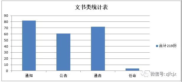 公司所有的文書(shū)類(lèi)如:通知、通告、公告、任命等統(tǒng)一有正規(guī)格式,經(jīng)編輯、審核、批準(zhǔn),統(tǒng)一由總裁辦渠道發(fā)布。經(jīng)對(duì)2018年文書(shū)類(lèi)統(tǒng)計(jì),各類(lèi)發(fā)布如下:通知82份、公告61份、通告72份、任命4份,合計(jì)共發(fā)布文書(shū)類(lèi)219份。