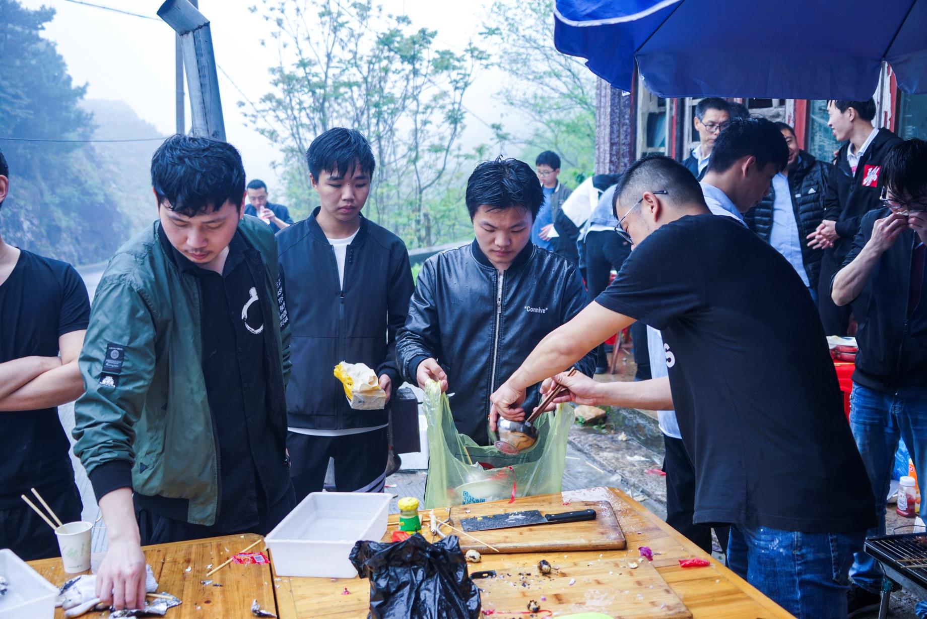 在各組成員吃飽喝足充滿能量之后 ,開始了此次活動最高潮部分——暴走。在開始暴走之前,參加暴走的全體成員在自行車協會牌前集合進行了合影留念,之后開始了暴走活動。天氣依然是跟早上一樣,三米開外的地方,似乎什么都看不清了,天空中也下著蒙蒙細雨,但一點也不影響我們的心情。大家一邊歡快地聊著天,一邊向上地攀登者。享受著霧蒙蒙的風景,在這詩情畫意中繼續著。很快我們從平坦的水泥路轉到了泥濘的山路中。疊翠的峰巒、茂密的森林和曲折盤旋的山路讓我們不禁陶醉其中,盡情領略大自然的風情。各個部門之間都彼此相互鼓勵、相互協助,不斷挑戰著自己。